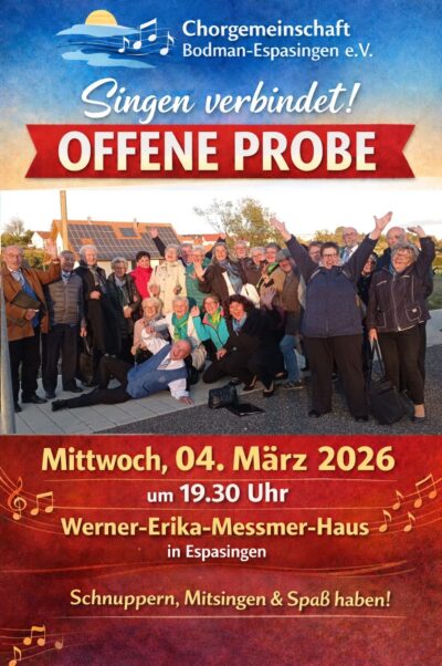 „Singen verbindet“ Chorgemeinschaft Bodman-Espasingen e.V. lädt zur „Offenen Probe“ ein Espasingen. Neue Stimmen, neue Begegnungen und vor allem die Freude am gemeinsamen Singen stehen ...