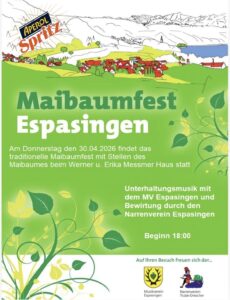 Am 30. April findet ab 18 Uhr auf dem Dorfplatz und im Werner- und Erika-Messmer-Haus das traditionelle Maibaumfest mit Stellen des Maibaums statt. Die Veranstaltung wird vom Musikverein Espasingen musikalisch umrahmt. Für das leibliche Wohl ist gesorgt.